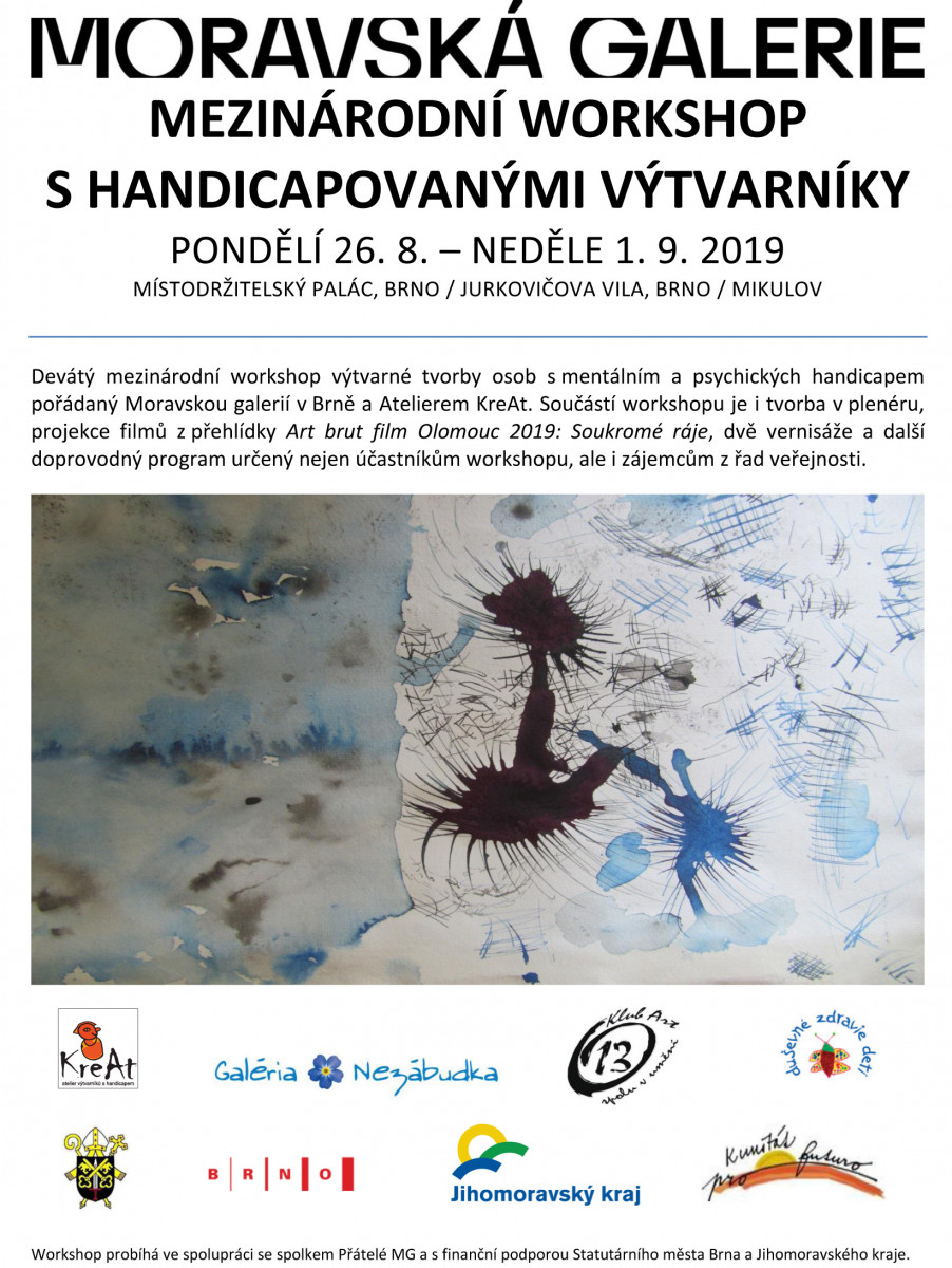 Devátý mezinárodní workshop 'výtvarné tvorby osob s mentálním a psychických handicapem pořádaný Moravskou galerií v Brně a Atelierem KreAt. Součástí workshopu je i tvorba v plenéru, projekce filmů z přehlídky Art brut film Olomouc 2019: Soukromé ráje, dvě vernisáže a další doprovodný program určený nejen účastníkům workshopu, ale i zájemcům z řad veřejnosti.