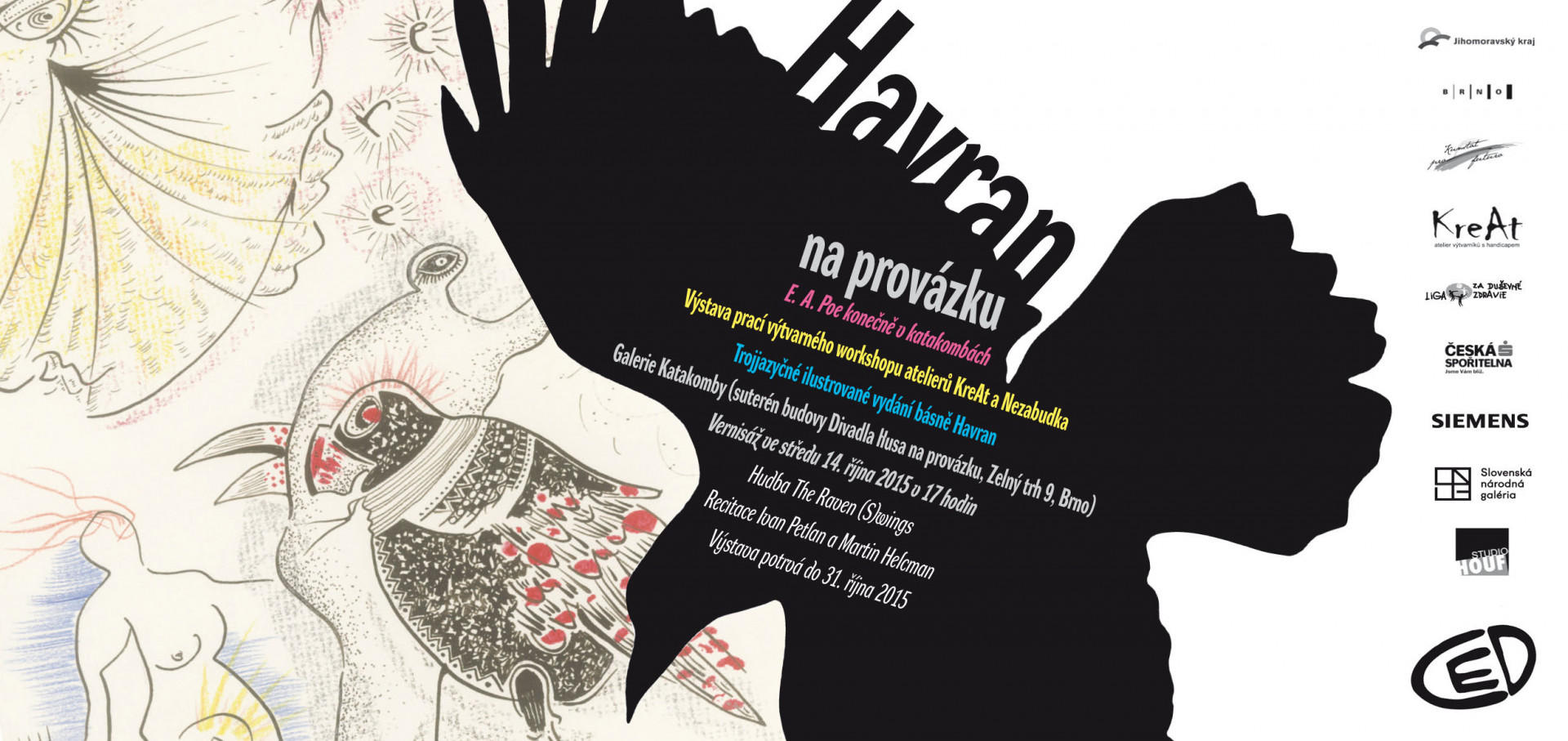 Poeovská výstava rekapitulující brněnský zářiový workshop se na zbytek roku přesunula z galerie Katakomby do galerie u kavárny Práh v objektu brněnské Vaňkovky. Sdružení Práh poskytuje sociální služby osobám s psychickým omezením, a je tak tedy pro atelier KreAt přirozeným partnerem. Vernisáž proběhne ve středu 25. listopadu v 18 hodin. Zahájí ji Dr. Blanka Veškrnová, ředitelka a předsedkyně sdružení. Výstava potrvá do 22. prosince 2015. Na vernisáži bude možno zakoupit trojjazyčné vydání Poeova Havrana, bibliofilii, kterou atelier KreAt letos vydal a kterou ilustračně doprovodili účastníci workshopu. Báseň na vernisáži rovněž zazní. Hudbou celou akci doprovodí písničkář Vít Šujan.