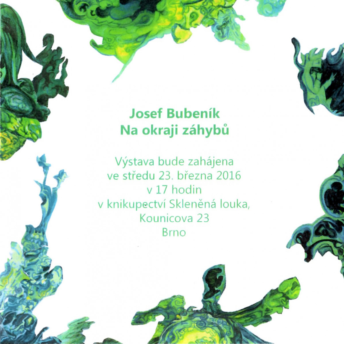 Výstava bude zahájena ve středu 23. března 2016 v 17 hodin v knihkupectví Skleněná louka, Kounicova 23 Brno.