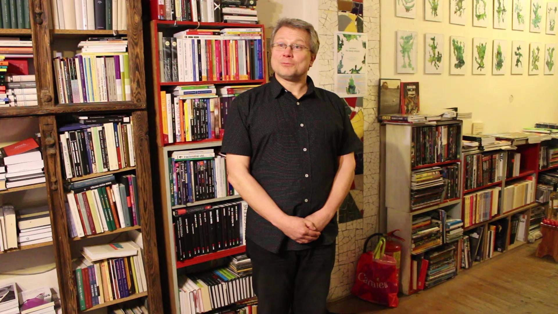 Miroslav Koupil a jeho performance nonsensové poezie na vernisáži jeho výstavy "Kaligramy a morseogramy" v Galerii Katakomby.