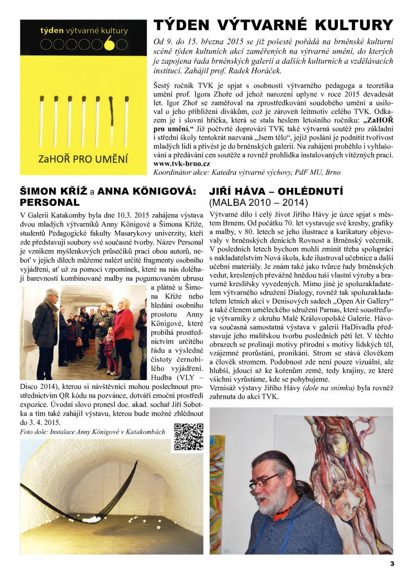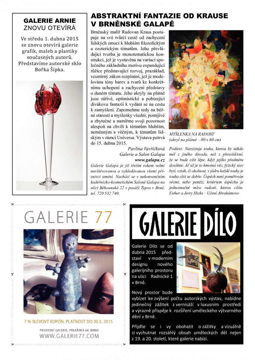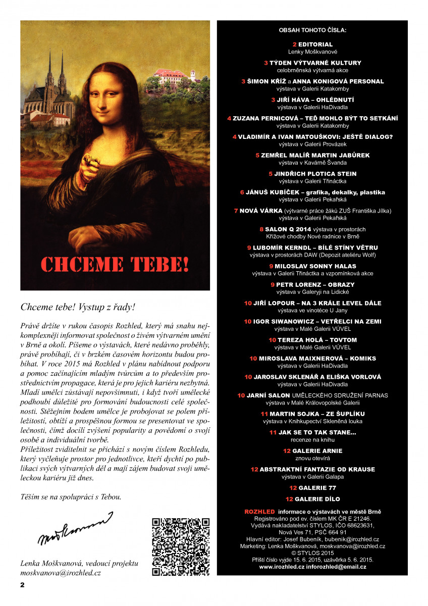 V redakci Rozhledu doufáme, že jste rok 2015 strávili přesně podle vašich představ. A obohatili jste se o chvilky strávené nad příjemným čtením dokumentujícím současné výtvarné dění a uměleckou aktivitu v Brně a okolí. Z redakce Rozhledu Vám všem děkujeme za Vaši přízeň. Dovolte nám popřát Vám sílu vstoupit do nového roku s nadějí a optimismem. více »
