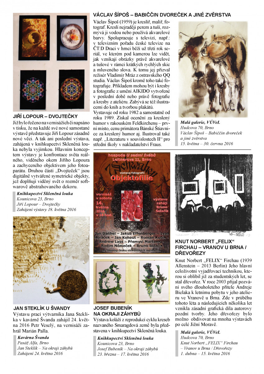 Museo Municipal – Cartago, Kostarika Dne 6. března 2016 se uskutečnila v bývalém hlavním městě Kostariky (Cartago) vernisáž mezinárodní kolektivní výstavy surrealismu, na které se účastní 107 umělců z 26 zemí celého světa.Mezi jinými jsou zde zastoupeni i tři výtvarníci z Brna: Josef Bubeník, Jiří Lopour a Jan Wolf. Výstava potrvá od 7. 3. do 7. 5. 2016   více »