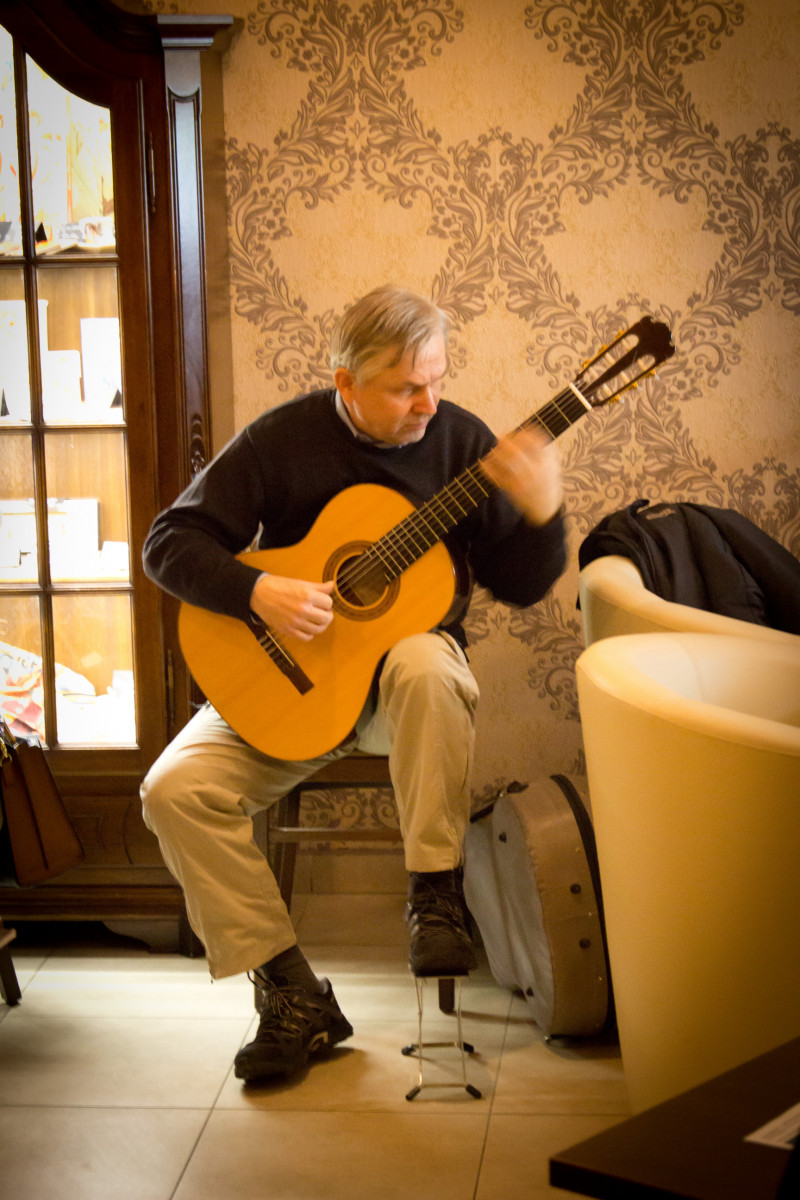 Na zahájení výstavy zahráli Adam Hlavatý na kytaru a Michael Ratislav na klavír